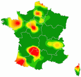 En France métropolitaine, la semaine dernière (2023s30), le taux d'incidence des cas de varicelle vus en consultation de médecine générale a été estimé à 10 cas pour 100 000 habitants (IC 95% [5 ; 15]). Ce taux est en diminution par rapport à la semaine 2023s29 (données consolidées : 21 [12 ; 30]) et est à un faible niveau d'activité par rapport à ceux observés habituellement en cette période.Au niveau régional, les taux d'incidence les plus élevés ont été observés en : Corse (39 [0 ; 85]), Bretagne (27 [0 ; 65]) et Hauts-de-France (26 [0 ; 57]).